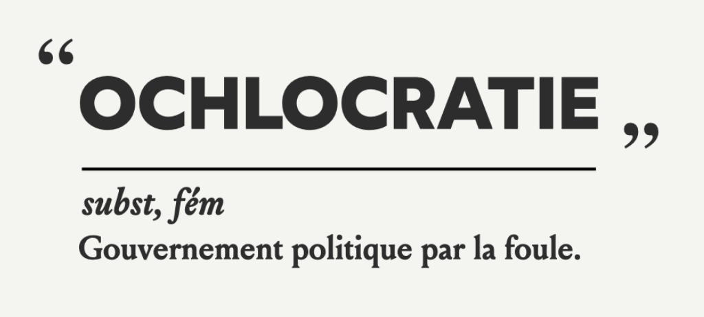 Tombé dans l’oubli, le mot Ochlocratie fait son grand retour. Formé à partir de okhlos–, « foule » et –kratos, « pouvoir », il désigne un gouvernement politique non pas par le peuple (démocratie) mais par la foule supposément plus chaotique, plus désordonnée mais aussi plus imprévisible. Longtemps présent dans les dictionnaires français, le mot a ensuite été retiré du Dictionnaire de l'Académie française en 1935 puis réintégré en 2019 dans certains dictionnaires majeurs suite au mouvement des Gilets jaunes. Nul doute qu’au regard de la crise politique actuelle, il sera pertinent d’observer comme la notion d’Ochlocratie pourra être réinvestie dans les mois et les années à venir.