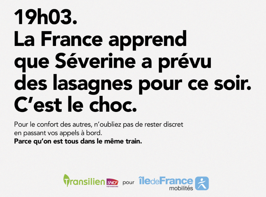 L’éditorial se fait de plus en plus rare dans les annonces publicitaires traditionnelles et pourtant il n’a rien perdu de sa superbe comme le démontre la dernière campagne du Transilien SNCF. Intitulée « Parce qu’on est tous dans le même train », la campagne s’attaque au sujet périlleux des incivilités et nuisances à bord des trains. Et plutôt que la dynamique répressive et le ton moralisateur habituellement utilisés, la marque opte pour un ton humoristique et connivent avec des accroches telles que « surtout, n’hésitez pas à nous dire si vos pieds veulent un café » ou « Lalalajefaiscommesijenavaispasvulamamiequiveutsasseoir ». Un dosage maîtrisé entre moquerie et bienveillance qu’on pourrait presque entendre les différentes intonations des messages. Plus que jamais, longue vie à l’édito.