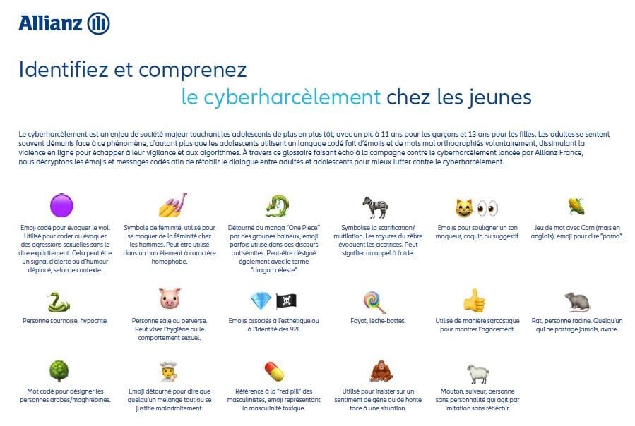 Alors, pour décoder ce nouveau langage et y déceler les potentiels signes de cyber-harcèlement, Allianz lance une campagne de prévention accompagnée d’une plateforme dédiée proposant un glossaire complet à consulter ici. Une manière de rappeler que la prévention commence par l’échange et que l’échange, lui, commence par parler le même langage.