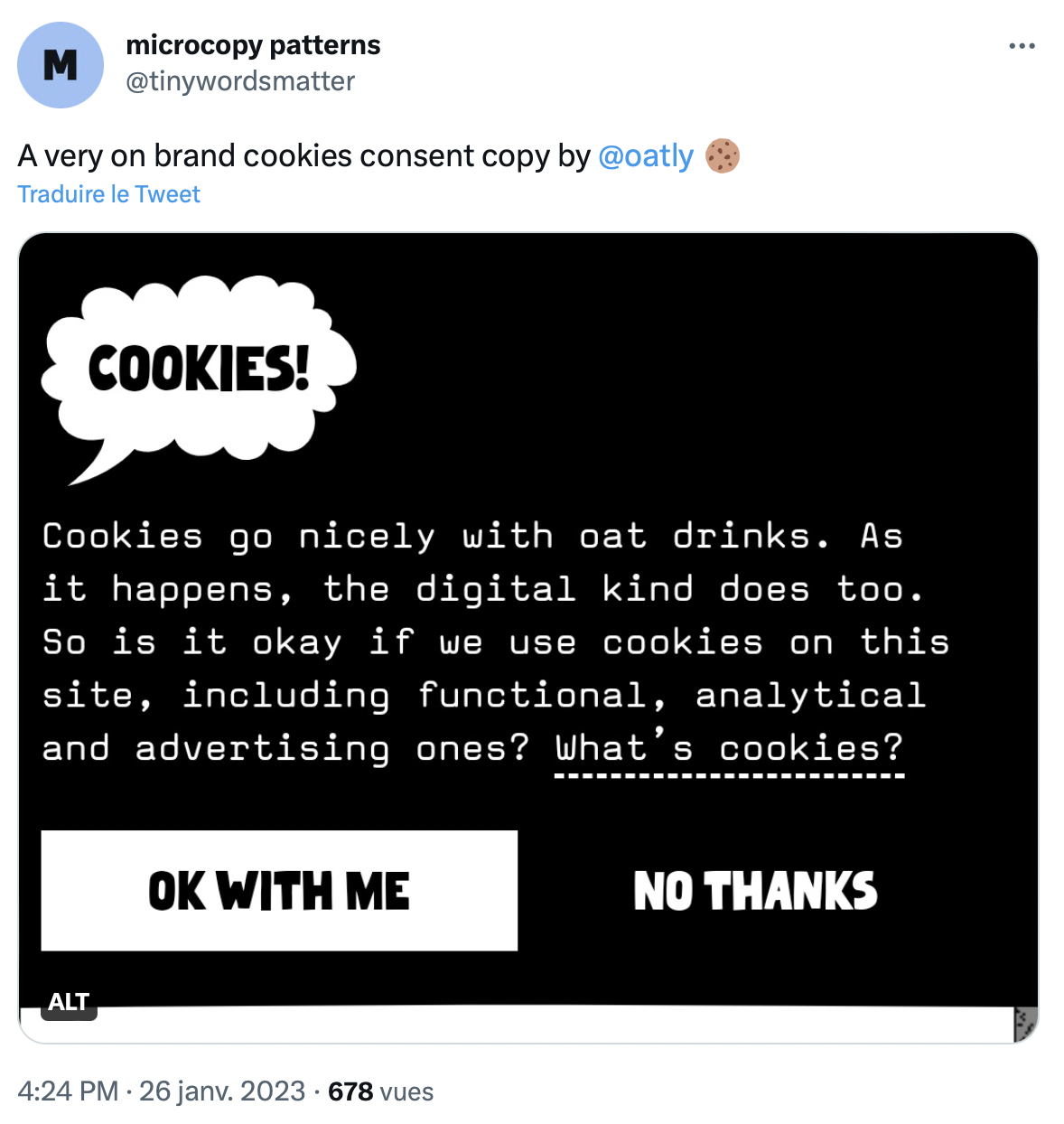 Dans le monde des marques, un outil de communication semble laissé pour compte : la micro-accroche. Vous savez, ces petits textes presque invisibles si l’on n’y prête pas attention car trop souvent complètement dépourvus de personnalité comme les messages d’erreur, les formulaire de newsletter ou encore les messages de consentement aux cookies. Pourtant, c’est bien dans les détails qu’un ton de voix se travaille et qu’une marque peut créer de la complicité avec sa communauté. Et pour voir ce que ça donne quand c’est bien fait, le compte Twitter @tinywordsmatter partage ses meilleures trouvailles de micro-accroches de marque. Alors, ne jugeons plus les accroches sur leur tailles mais sur leur efficacité.
