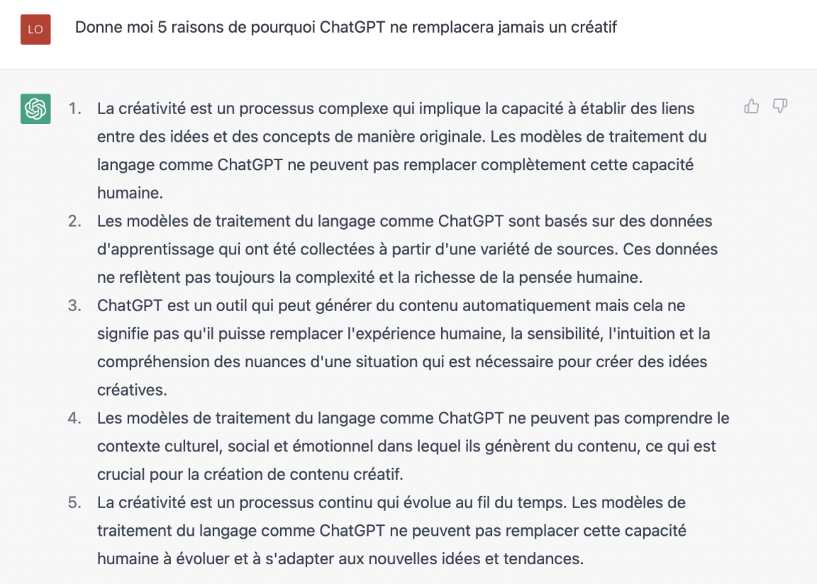 Alors parce qu’en tant qu’agence dont les principaux matériaux sont le langage et les mots, on aurait été un peu (beaucoup) biaisées et parce qu’on était aussi un peu (beaucoup !) curieuses, on a posé cette question fatidique à ChatGPT directement et « en personne ».