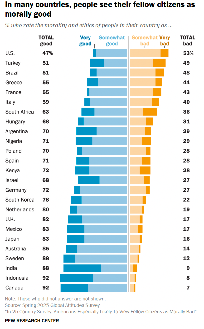 Ce que mesure vraiment ce sondage, ce n'est pas la moralité réelle des gens, mais l'image qu'on se fait de sa société. La polarisation politique joue un rôle majeur : dans plus de la moitié des pays sondés, les personnes qui ne soutiennent pas le parti au pouvoir sont particulièrement enclines à juger leurs compatriotes immoraux. Il s’agit là moins d’un verdict sur autrui que d’un baromètre de la défiance et du délitement du lien social.